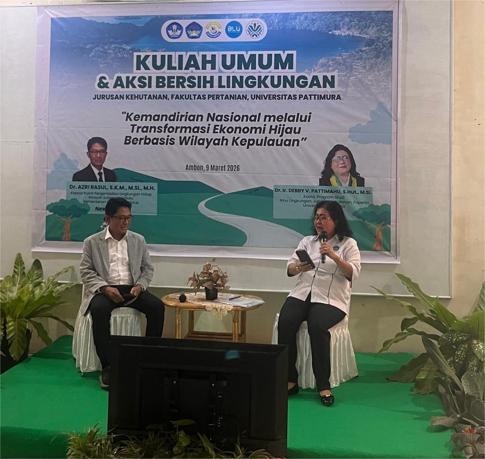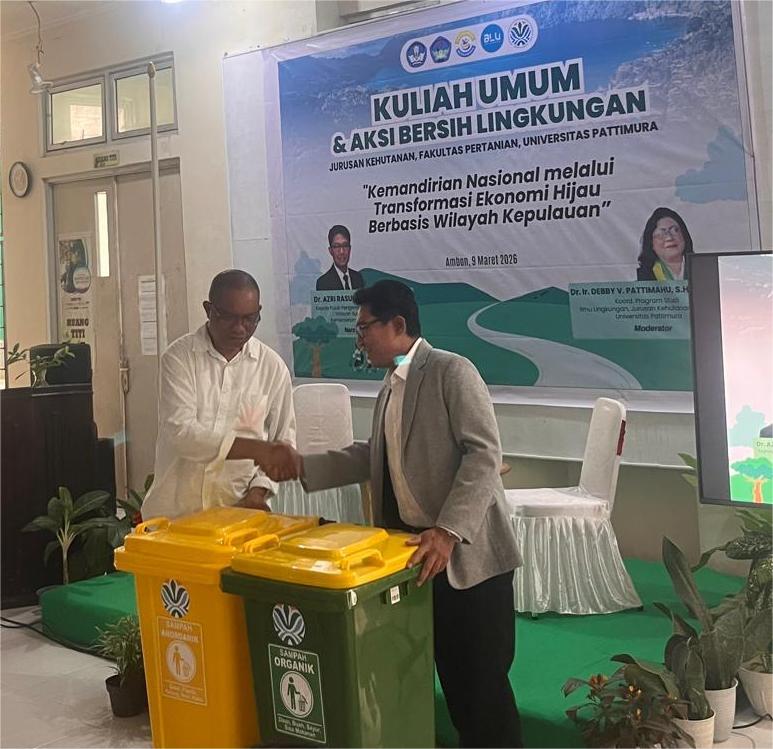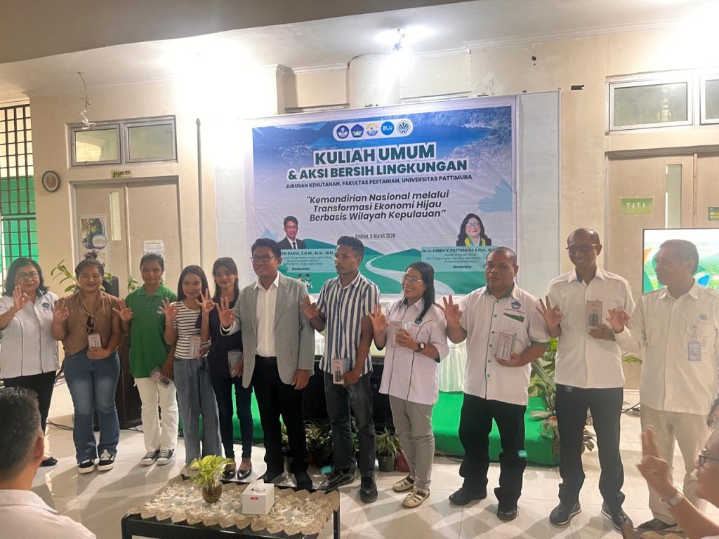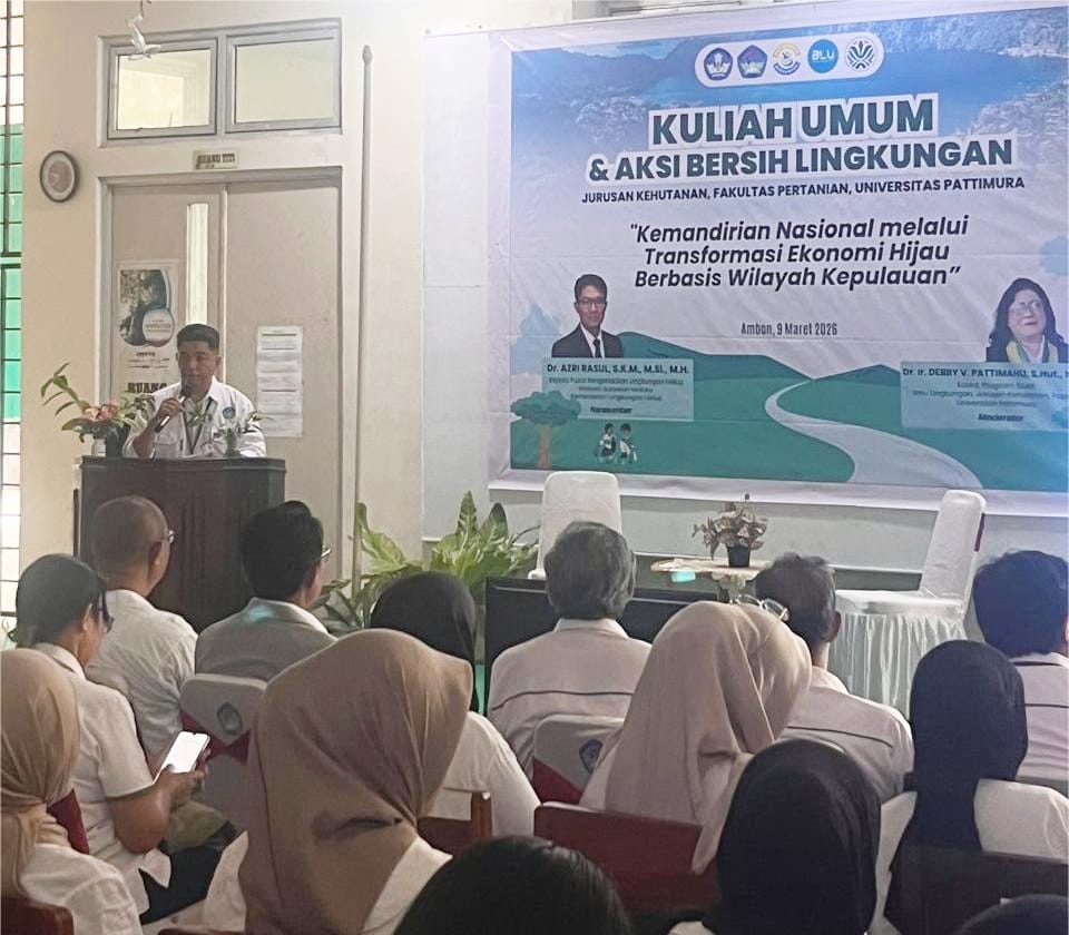 Ambon – Jurusan Kehutanan Fakultas Pertanian Universitas Pattimura menyelenggarakan kegiatan Kuliah Umum dan Aksi Bersih Lingkungan pada Senin, 9 Maret 2026, bertempat di Gedung Jurusan Kehutanan Fakultas Pertanian. Kegiatan ini mengusung tema “Kemandirian Nasional melalui Transformasi Ekonomi Hijau Berbasis Wilayah Kepulauan.”