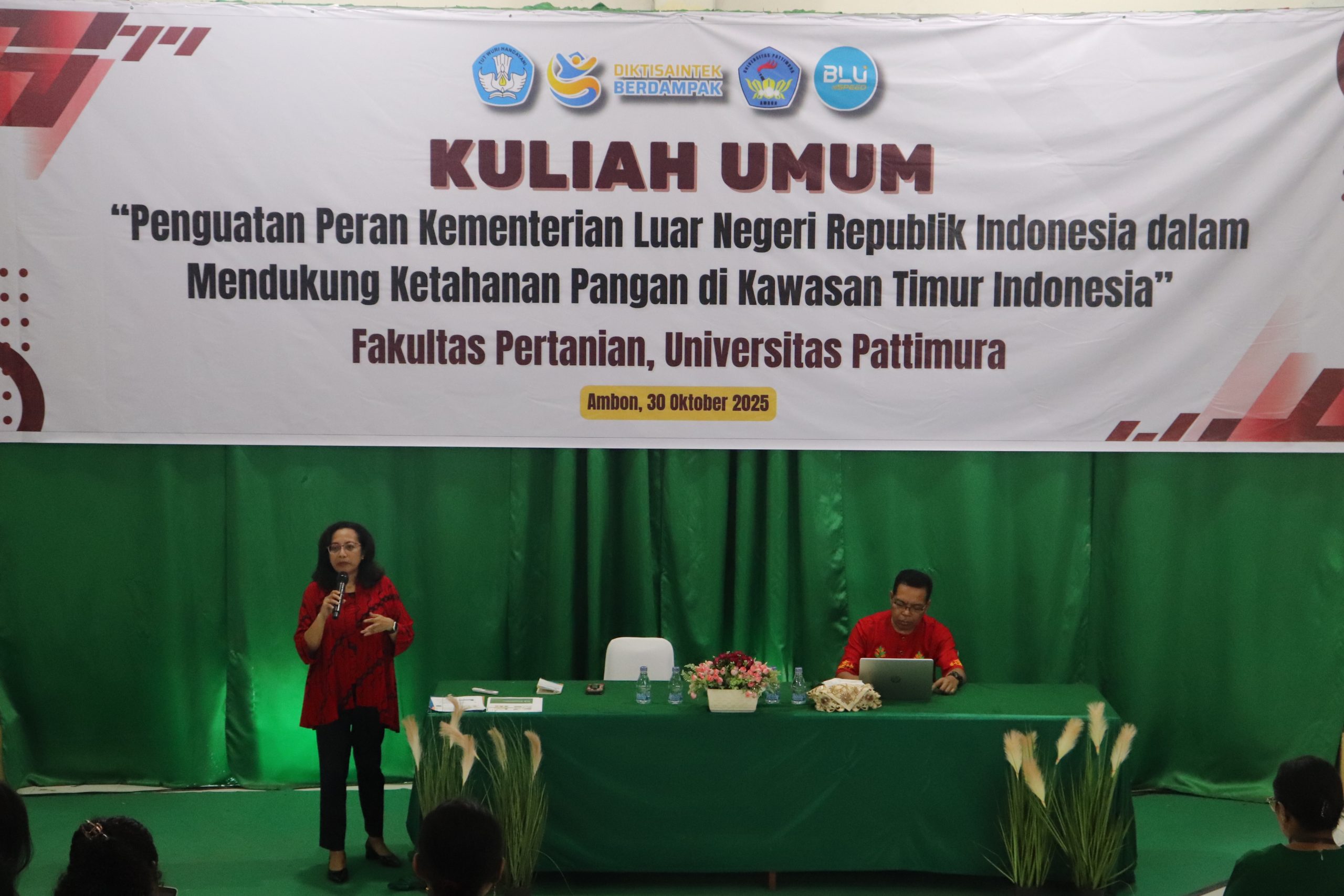 Ambon, 31 Oktober 2025 — Fakultas Pertanian Universitas Pattimura kembali menghadirkan kegiatan akademik yang inspiratif melalui Kuliah Umum bertema “Penguatan Peran Kementerian Luar Negeri Republik Indonesia dalam Mendukung Ketahanan Pangan Kawasan Timur Indonesia”. Kegiatan yang berlangsung di Auditorium Fakultas Pertanian ini dihadiri oleh para dosen dan mahasiswa, serta menghadirkan narasumber dari Kementerian Luar Negeri Republik Indonesia, yakni Ibu Spica Tutuhatunewa, Kepala Pusat Strategi Kebijakan Kawasan Amerika dan Eropa.