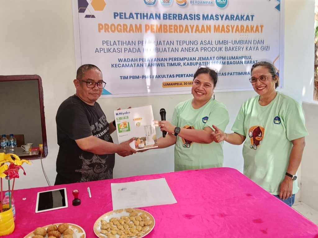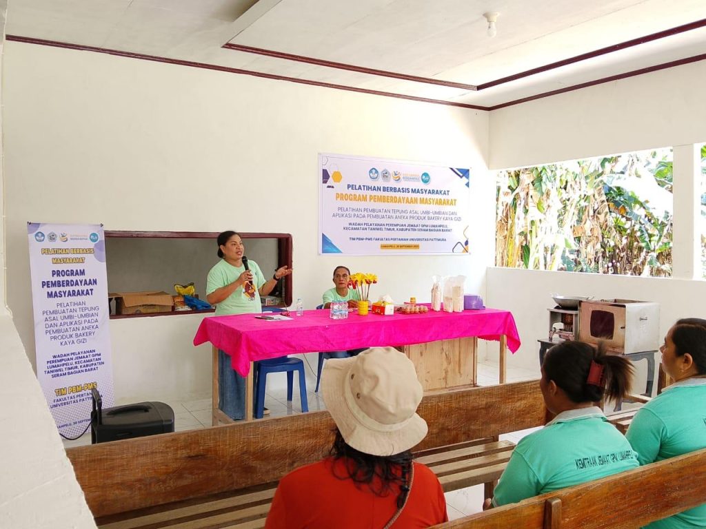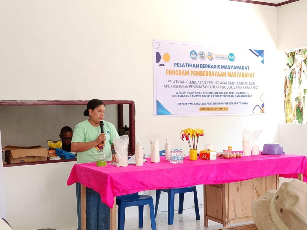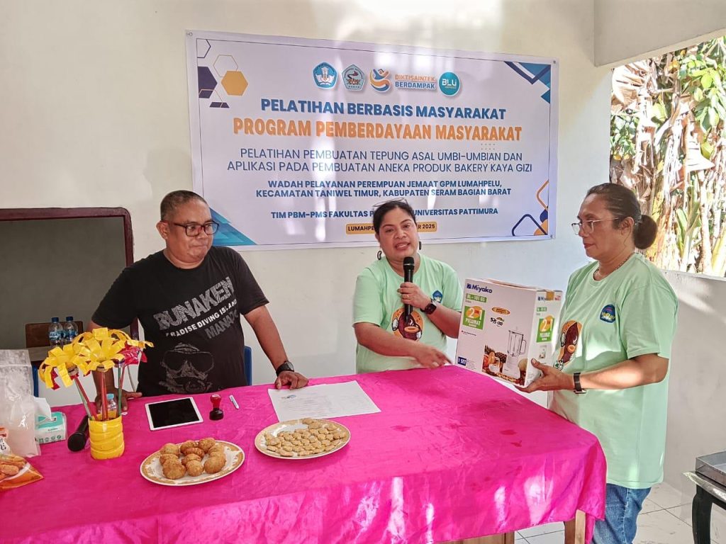 Seram Bagian Barat, 30 September 2025 — Tim dosen Universitas Pattimura melaksanakan kegiatan Pelatihan Pembuatan Tepung Asal Umbi-Umbian dan Aplikasinya pada Aneka Produk Bakery Kaya Gizi bagi ibu-ibu Wadah Pelayanan Perempuan Jemaat GPM Lumahpelu, Kecamatan Taniwel Timur, Kabupaten Seram Bagian Barat.