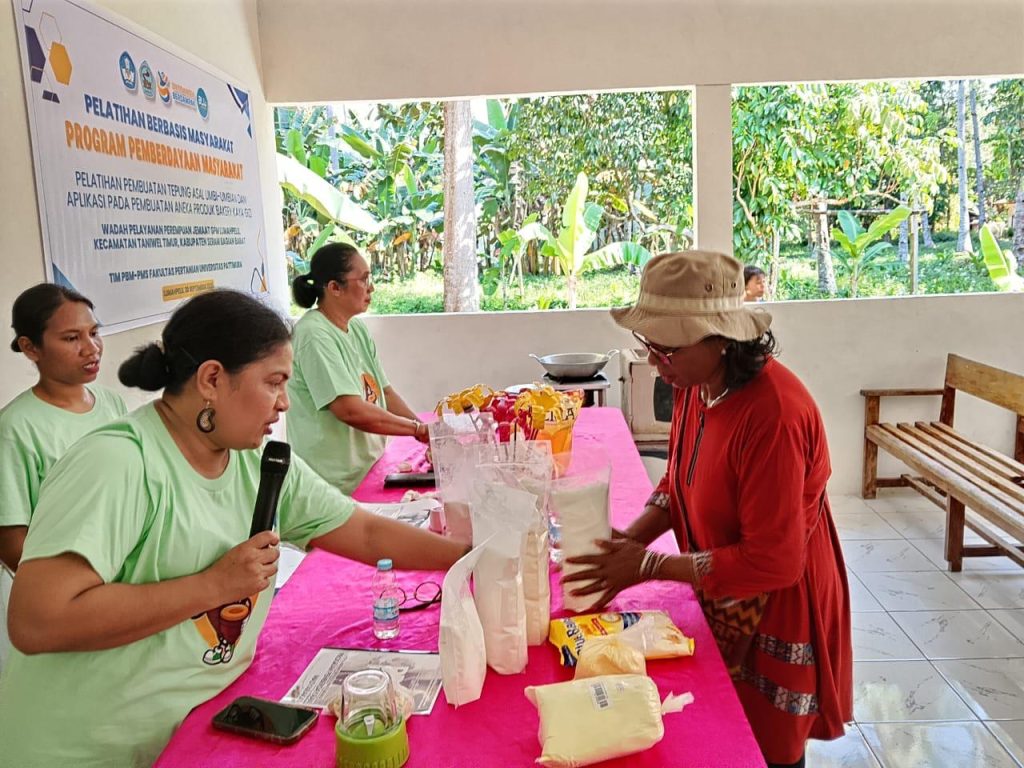 Pelatihan yang berlangsung pada 30 September 2025 pukul 14.00–18.00 WIT ini bertujuan untuk meningkatkan keterampilan ibu-ibu dalam mengolah hasil kebun lokal seperti ubi kayu, ubi jalar, dan keladi menjadi tepung, yang kemudian diaplikasikan pada pembuatan cake dan cookies bergizi tinggi dan bernilai jual.